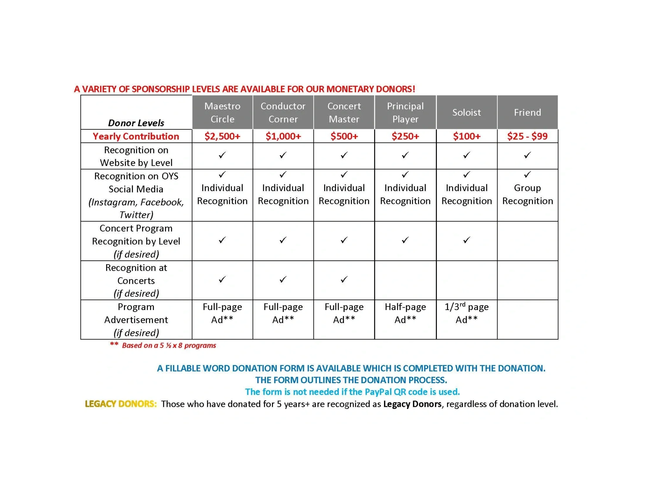 A variety of sponsorship levels are available for our monetary donors. Please review the SPONSORSHIP LEVELS chart below for more details.